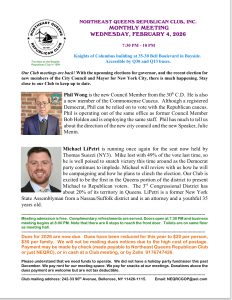 Meeting location is Knights of Columbus, 35-30 Bell Boulevard, Bayside, NY 11361.