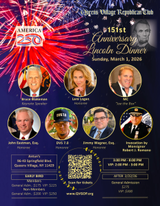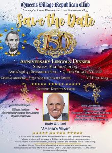 Queens Village Republican Club Lincoln Dinner + Add to Google Calendar + iCal / Outlook export 00 days 00 hours 00 minutes 00 seconds Date Mar 01 2026 Time 3:00 pm - 8:00 pm Category Club Meetings Public Share this event